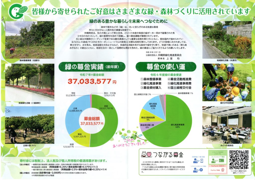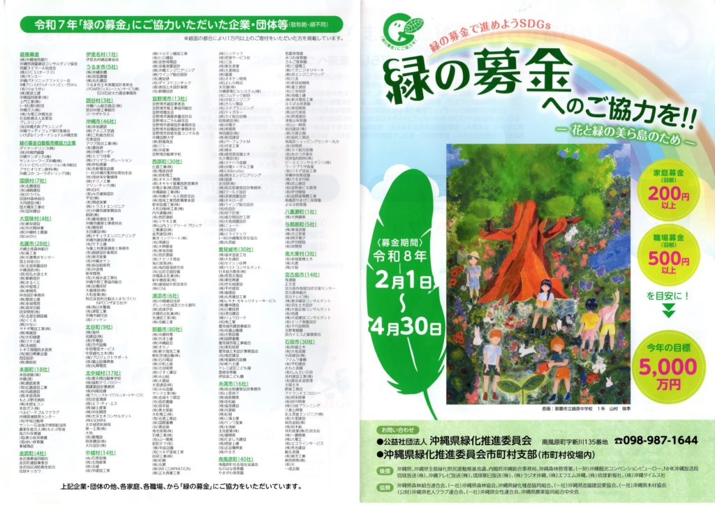 ★緑の募金へのご協力を!ー花と緑の美ら島のためー ★「募金期間」令和8年2月1日~4月30日★ ●お問い合わせ● 公益社団法人沖縄県緑化推進委員会☎098-987-1644