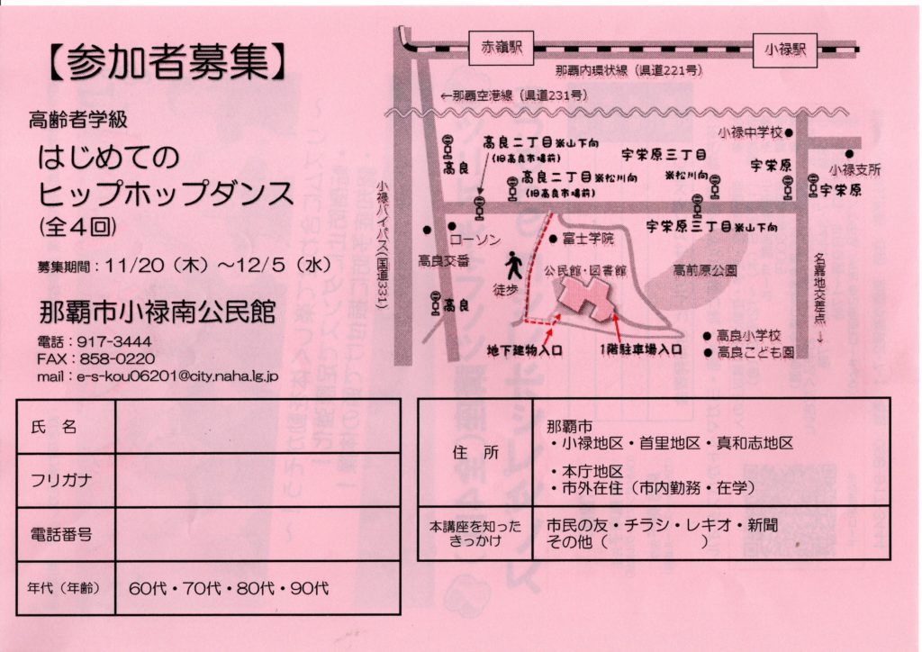 ☆シニアチャレンジ講座(全4回)はじめてのヒップホップダンス☆場所:那覇市小禄南公民館ホール