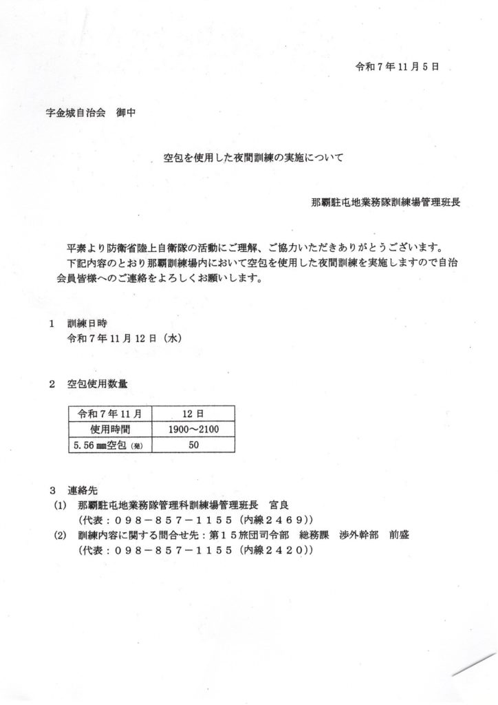 ☆彡「令和7年11月5日付けによる防衛省陸上自衛隊那覇訓練場内において、下記内容のとおり空砲を使用した夜間訓練の実施についてのお知らせ!」☆彡