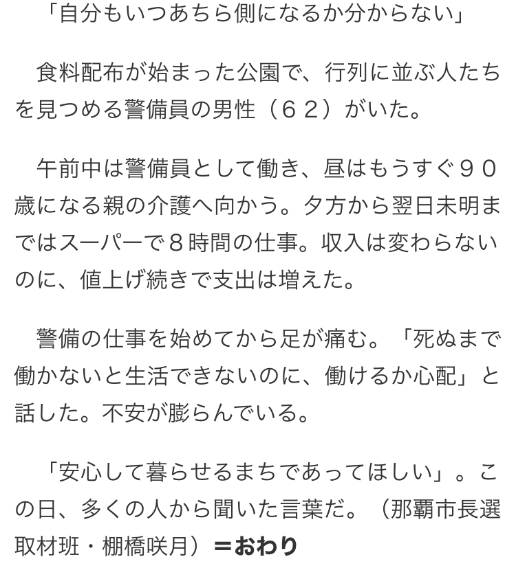 「死ぬまで働かないと・・・」収入少なく、物価は高い那覇 値上げが追い打ち 市民が口にした不安