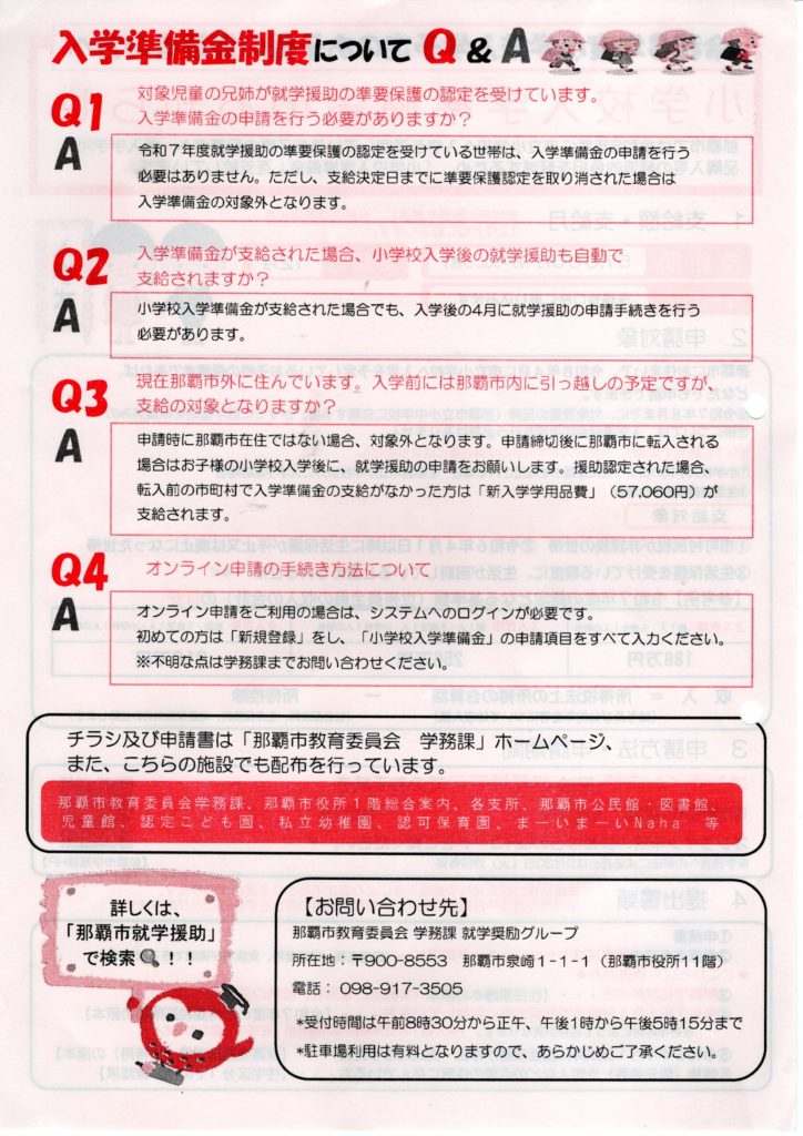 那覇市では令和8年度に市立小学校へ入学を予定しているお子様の保護者へ、新入学学用品購入等の経済的負担を軽減するため、「小学校入学準備金」を支給しています。