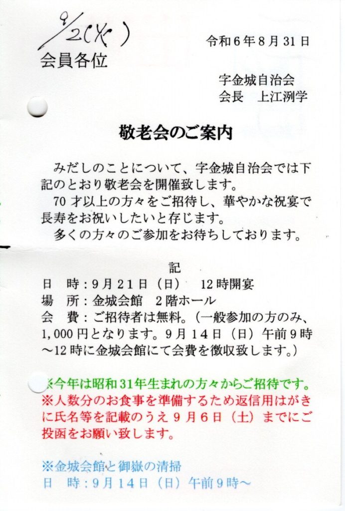 さて、本年も恒例の敬老会を下記の通り開催いたします。