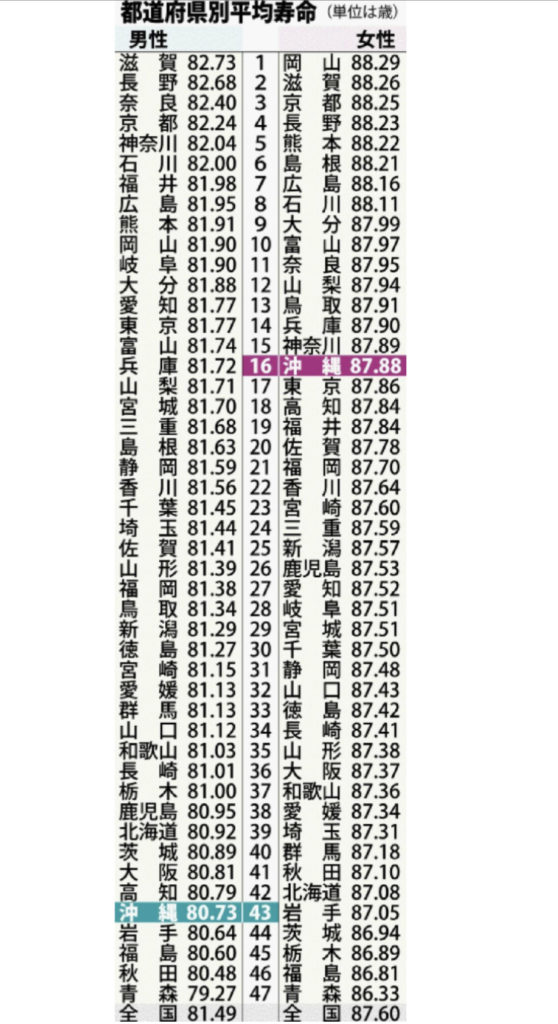 沖縄男性の平均寿命が転落‼️ワースト5😱