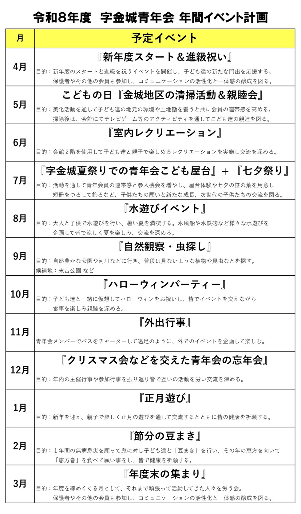 今年度も、地域の子供達や若者達と共に字金城の明るい未来を創り上げるべく、青年会メンバーを募集しております♪ 一緒に地域の若者やお年寄りが笑顔で参加したくなるイベントを企画してみませんか❓